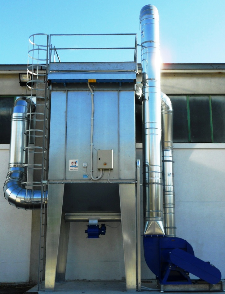 L'aria aspirata, carica di polveri di lavorazione, fluisce all'interno del filtro attraverso la tramoggia dove avviene la caduta delle particelle pi� grosse, poi attraverso le maniche filtranti, dall'esterno all'interno, depositando su di esse le particelle pi� fini.