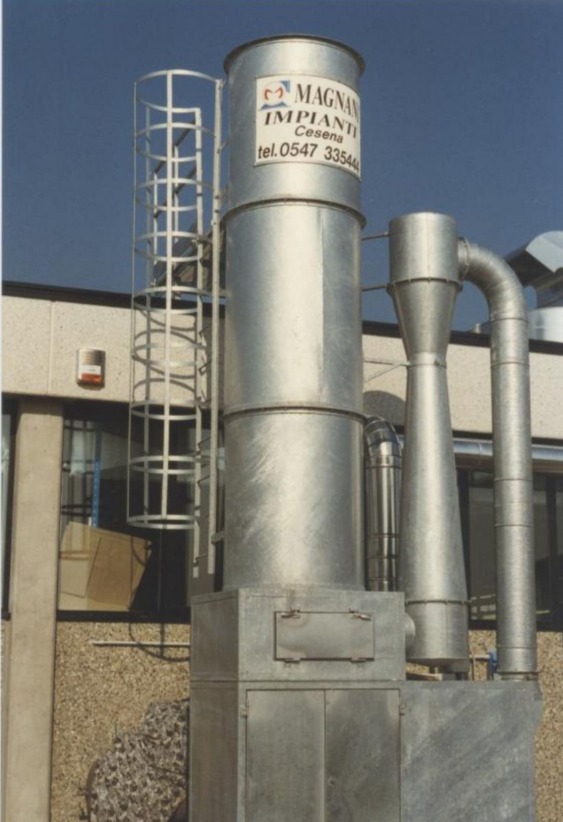 In essa si ha separazione di acqua e fango dall'aria, l'acqua ed il fango scendono nei sacchi di raccolta, l'aria sale verso l'alto lungo il camino di emissione.
