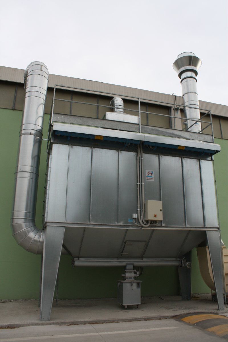 L'aria aspirata, carica di polveri di lavorazione, fluisce all'interno del filtro attraverso la tramoggia dove avviene la caduta delle particelle pi� grosse, poi attraverso le maniche filtranti, dall'esterno all'interno, depositando su di esse le particelle pi� fini.