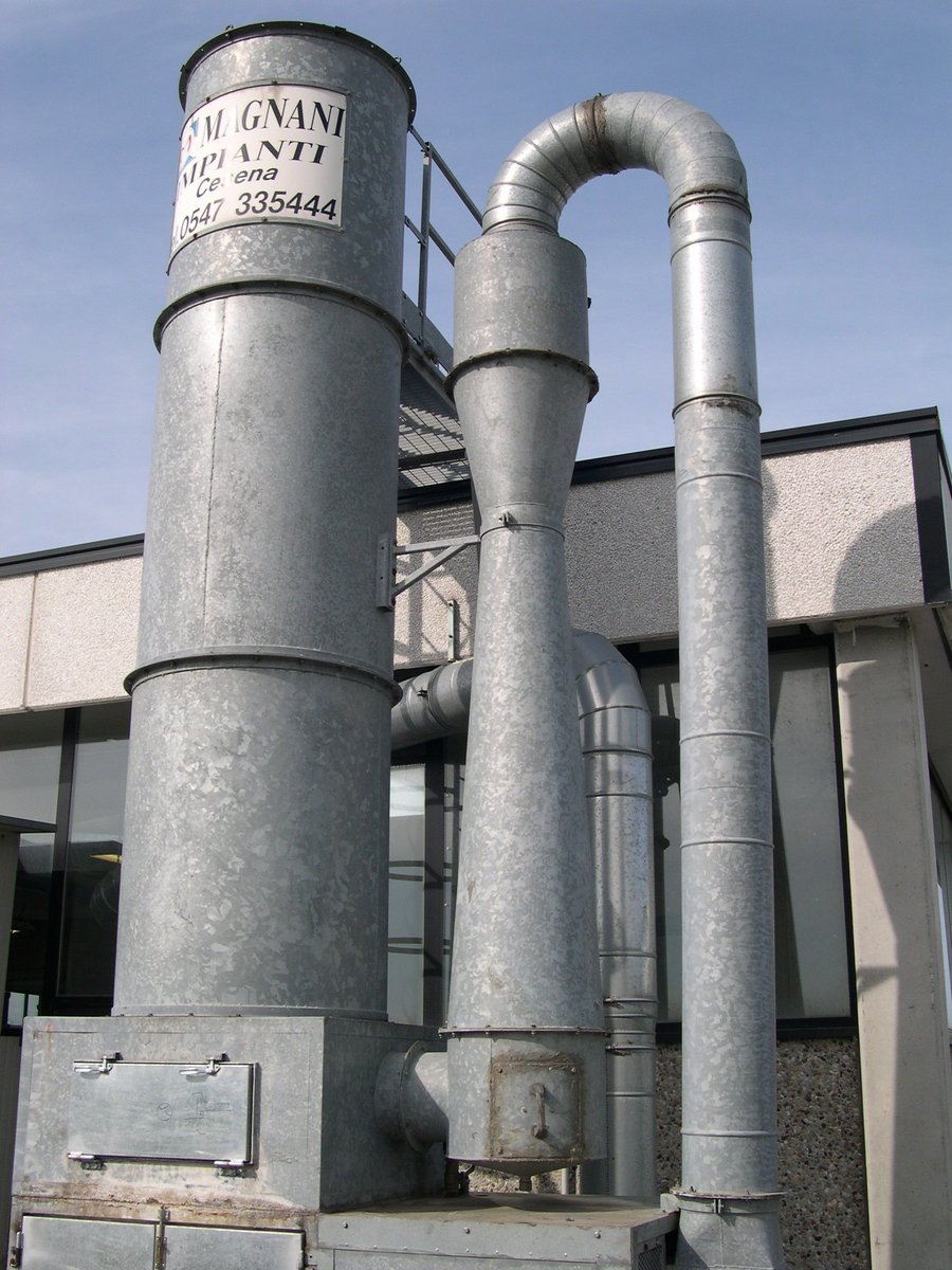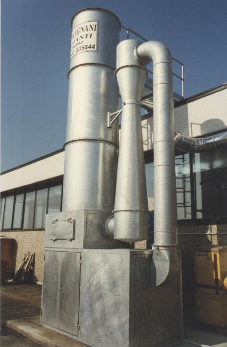 In essa si ha separazione di acqua e fango dall'aria, l'acqua ed il fango scendono nei sacchi di raccolta, l'aria sale verso l'alto lungo il camino di emissione.